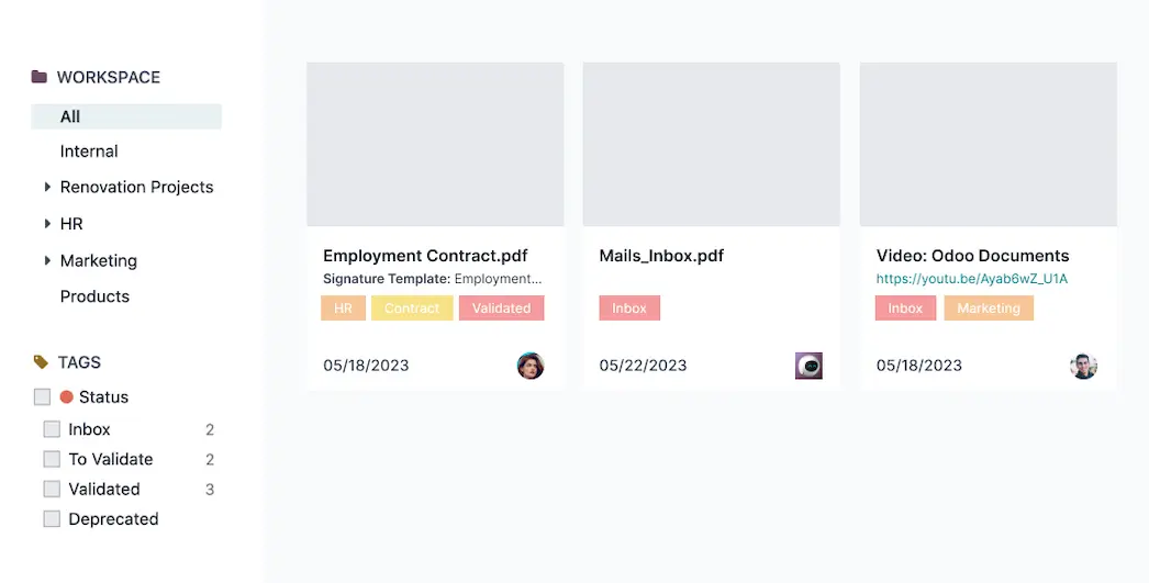 With Odoo Documents, you can oversee your files online from a single platfor.m: eliminate the need for scanning contracts, manually inputting invoices, and lengthy inspection workflows.