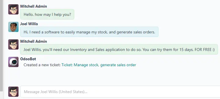 Get alerts and access a chat interface no matter which Odoo application you are utilizing. Your conversations are consistent throughout the database, so you'll always have the chance to connect.